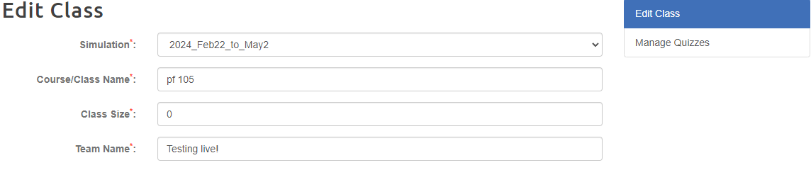 Thanks to our teacher feedback, we have taken our quiz scheduling tools out of beta! We've added a "Manage Quizzes" button to each class section on Teacher Home for quick access to managing your quiz schedule. This button is available during all phases of the simulation. To learn more about extending quiz deadlines beyond the simulation, read more here.